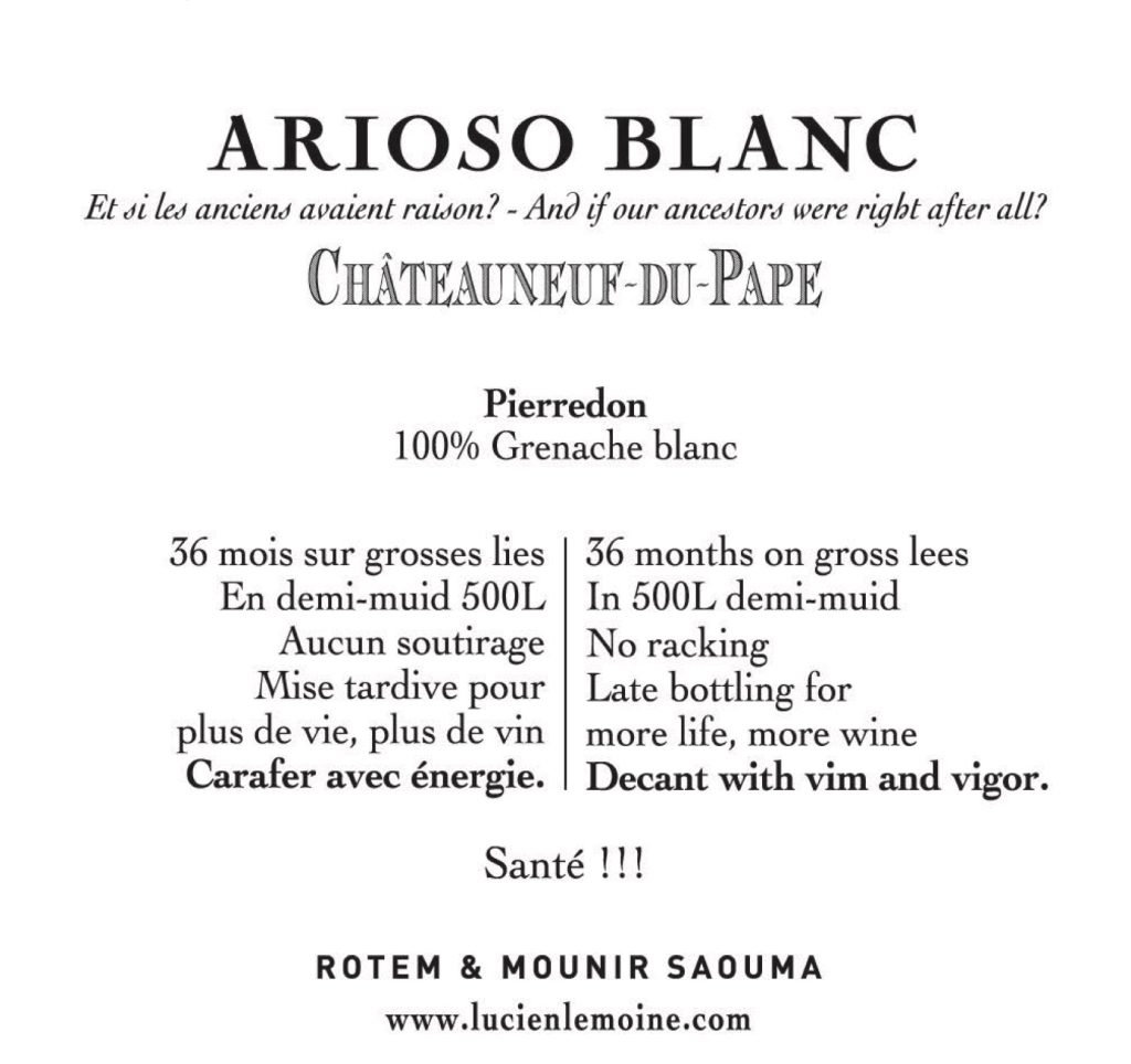En 2009, l’achat de 2 hectares de Châteauneuf du Pape Rouge sur le lieu-dit PIGNAN lance la création du Domaine Rotem et Mounir Saouma ; les vignes sur ces 2 parcelles furent plantées en 1940 et 1961 et donneront naissance à notre Arioso.